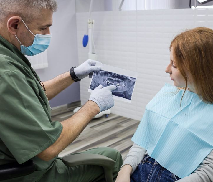 Осмотр и рентген — врач оценивает состояние опорного зуба, штифта или импланта.